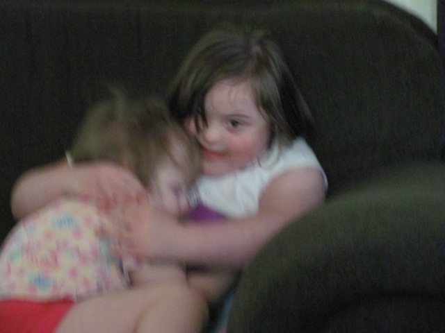 Fianlly, there is this picture. Not great focus but totally natural. Masha had crawled up into Caelia's lap and was falling asleep.
